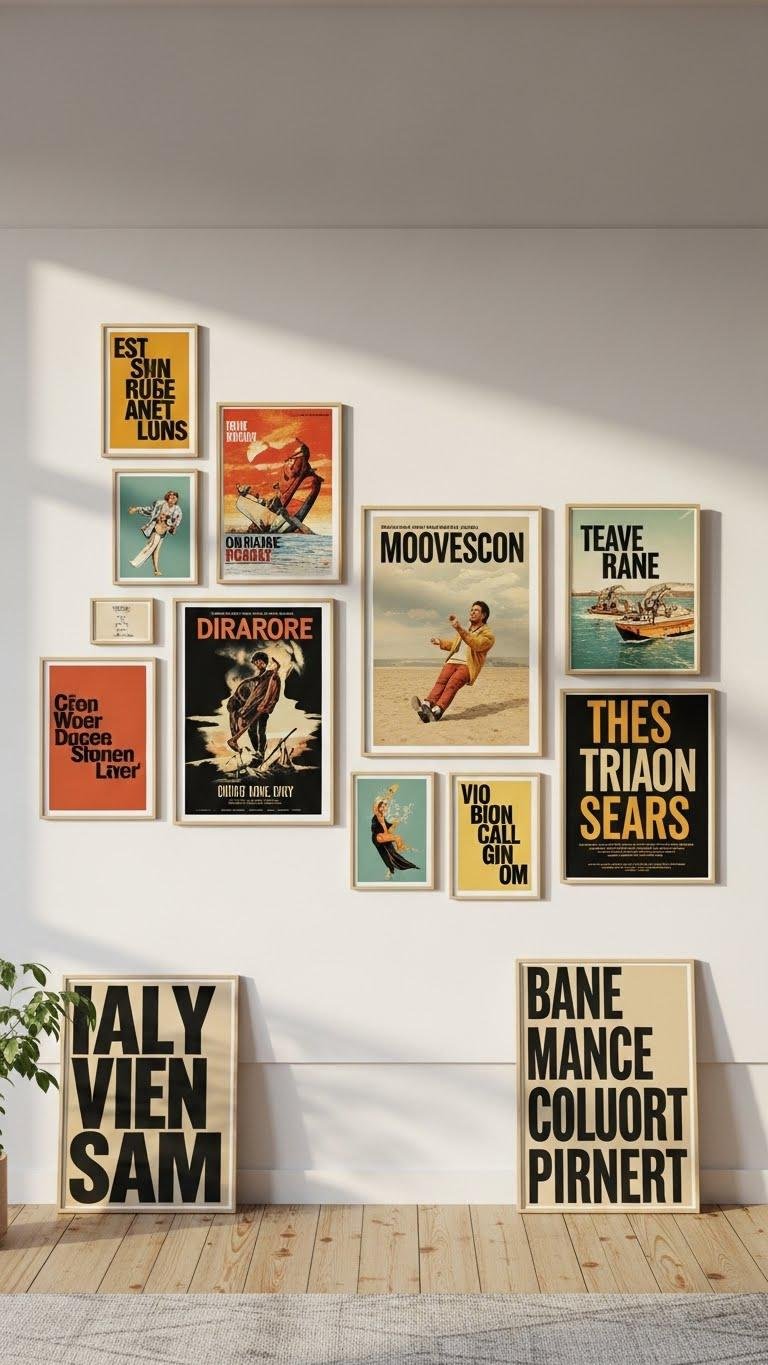 When you arrange a vintage poster collage, you turn a blank wall into a curated time capsule—bold typography, faded inks, and graphic simplicity combine to create instant personality. You’ll mix retro typography, movie ephemera, travel ads and concert prints for a liberated, lived-in vibe. Frame sizes and spacing set rhythm; stick to a restrained palette so each piece breathes and your room feels confidently free.