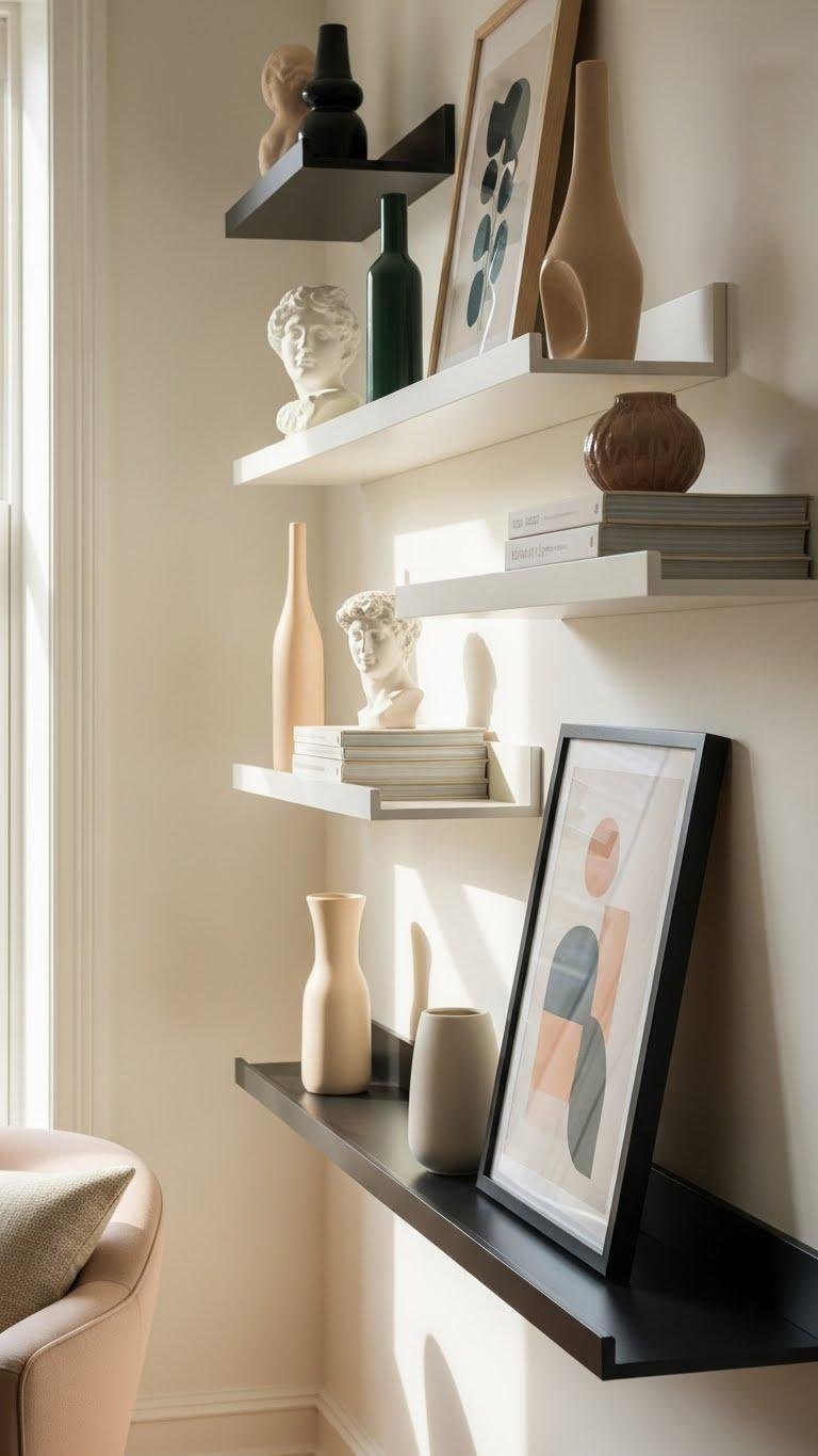 Layered Floating Shelves With Art