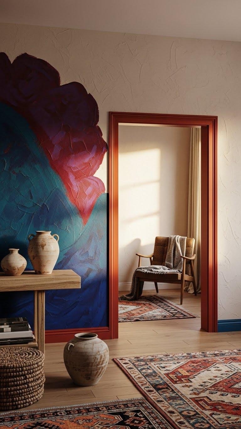 After framing doorways and trim in bold hues, bring that same confidence to a single wall by commissioning a hand-painted mural or applying a rich textured finish—your room will gain instant personality and a focal point that feels artisanal, not staged.