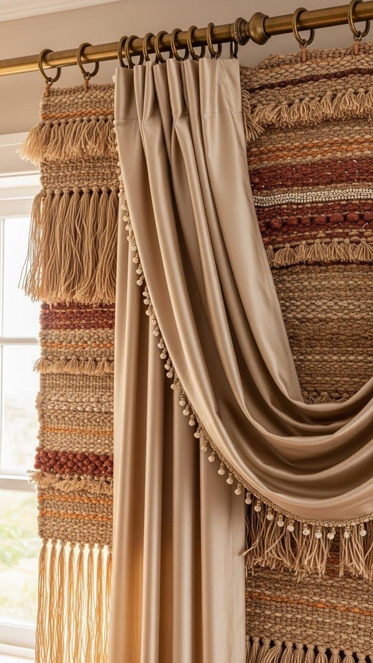 When you pair sumptuous silk curtains with textured woven hangings, you get a balance of luxury and artisanal warmth that lifts a room instantly. Let silk drape freely on an antique rod with brass finials while woven panels — hand stitched and layered — add tactile depth. Choose a beaded trim for subtle sparkle; mix scale confidently to express liberated, bold style.