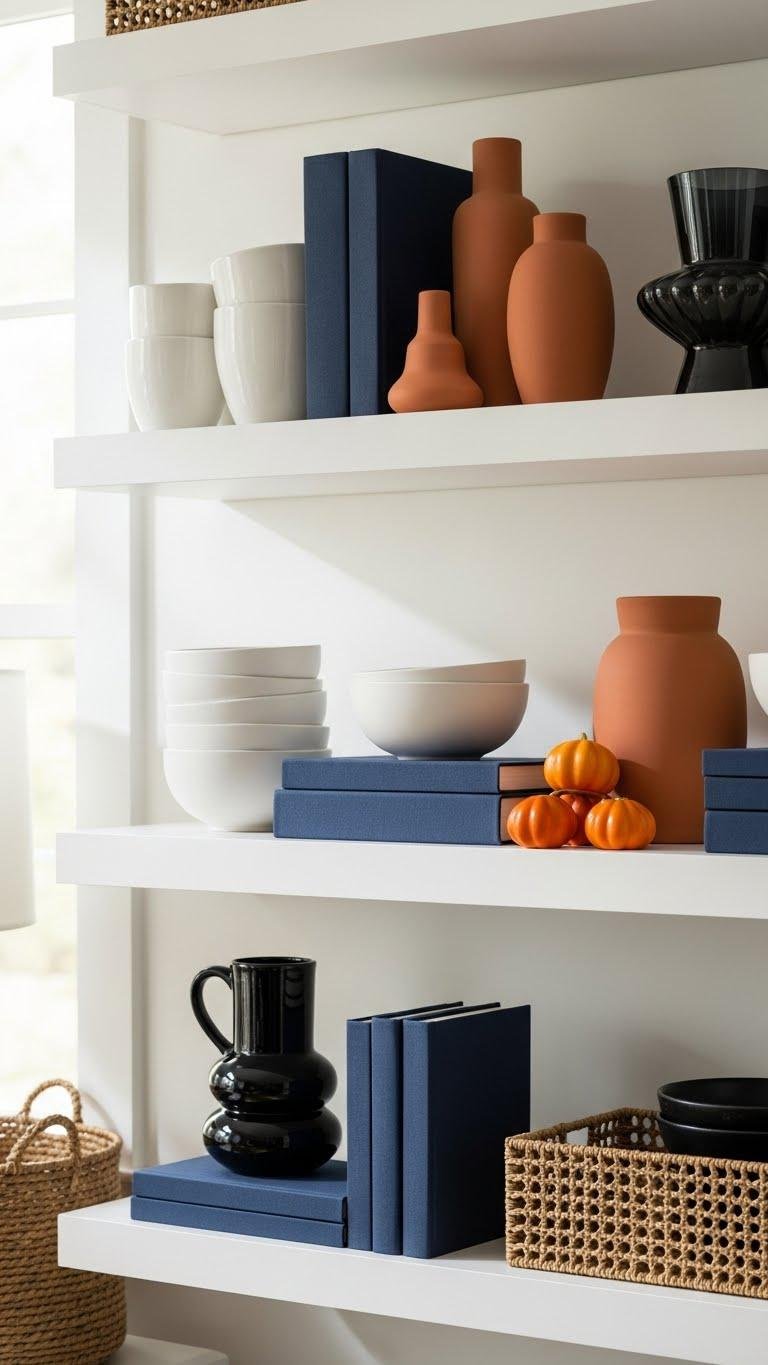 Start by editing what goes on each shelf so every group reads like a mini-installation rather than a jumble. You’ll arrange objects by scale, hue, and theme, using curated color blocking to anchor each vignette. Mix textures and negative space, label or not as you prefer, and plan rotating seasonalizations to keep displays fresh. This lets your shelves feel intentional, bold, and free.