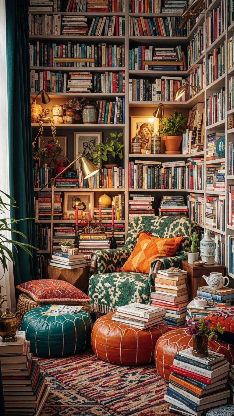 You’ll layer floor to ceiling bookshelves with varied spines, mix art and objects, and anchor a reading chair cluster with poufs and throws.