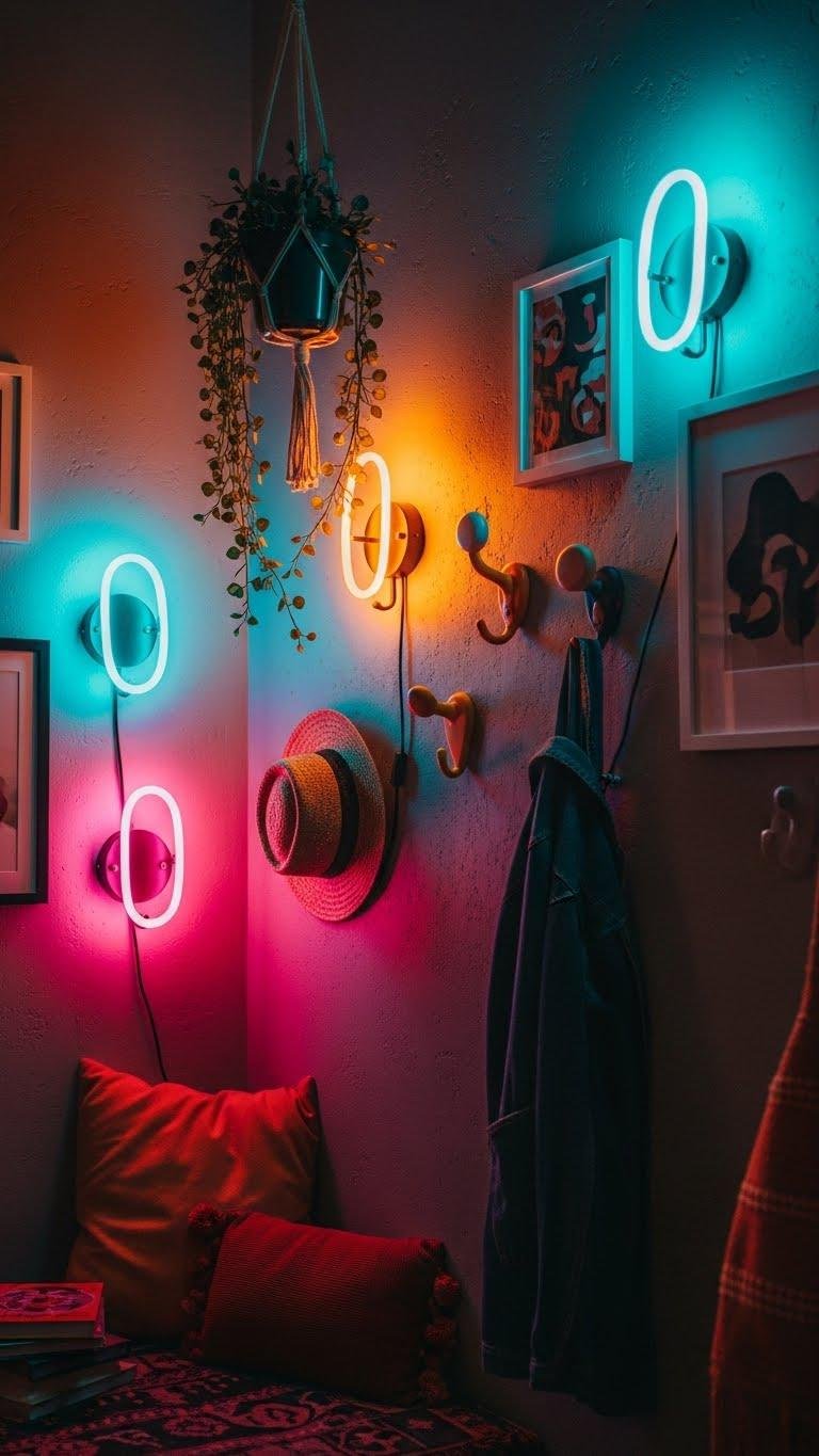 Want to inject instant personality into your nook? Add neon sconces for energetic, sculptural light that highlights color and mood. Mix in playful hooks to hang plants, hats, or art—functional flair that refuses blandness.