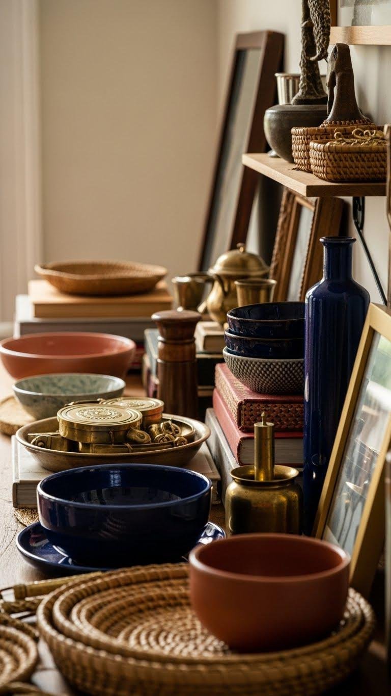 Show off your travel finds and family heirlooms with purpose: group pieces by color, material, or story so each arrangement reads like a curated vignette rather than a cluttered collection.