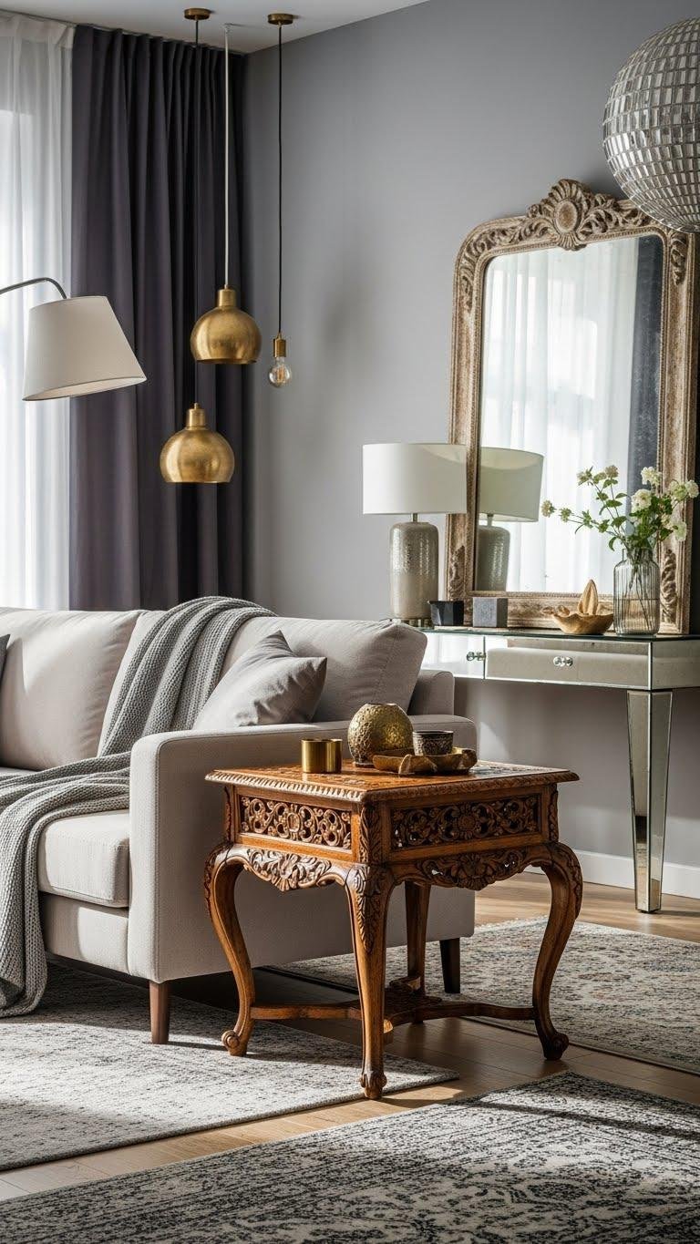 You’ll contrast clean-lined sofas with an antique side table, pair thrifted lighting with contemporary pendants, and balance ornate mirrors against mirrored consoles for glam reflection.