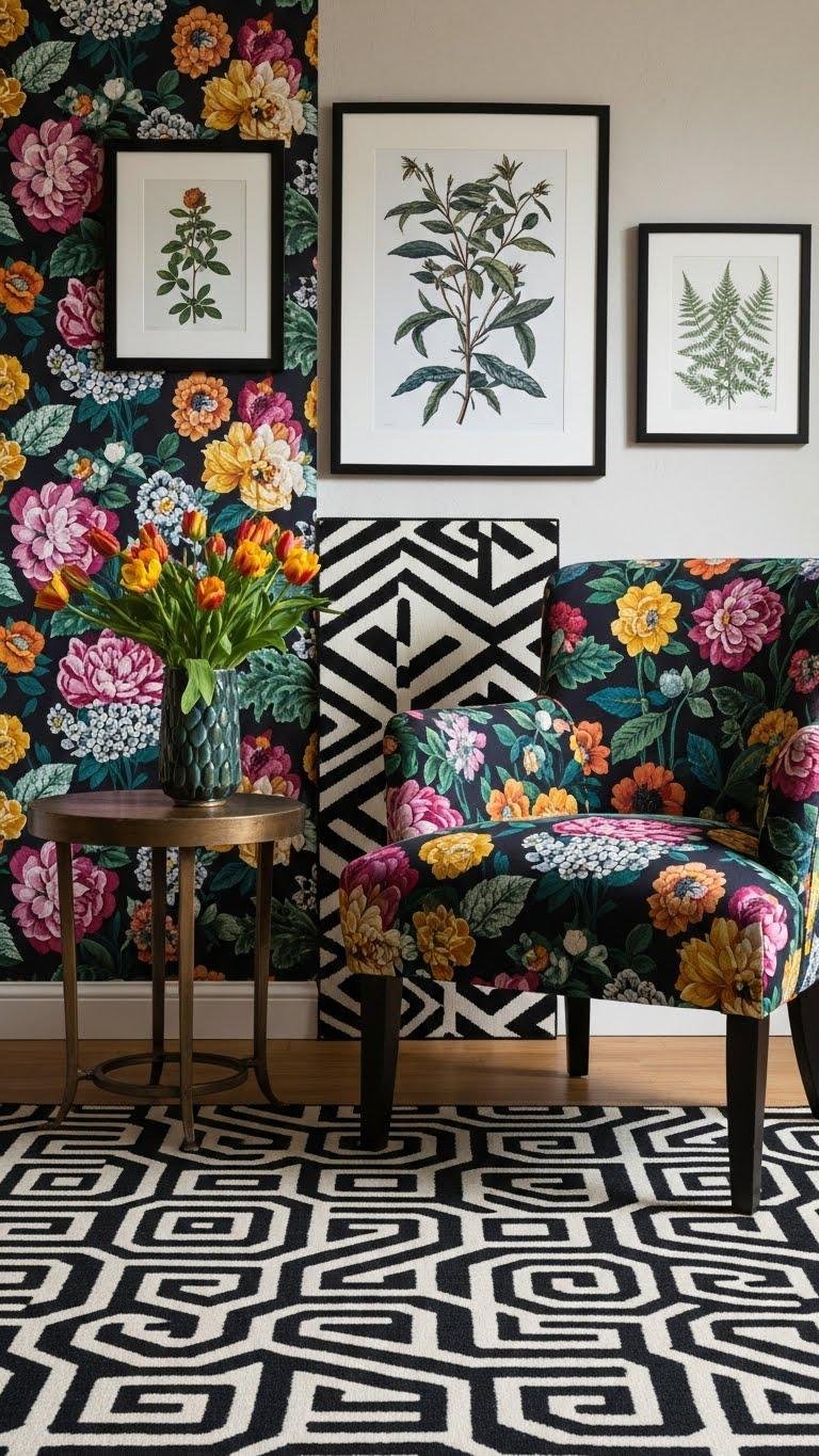Pair bold florals with sharp geometrics to create visual tension that feels curated rather than chaotic. You’ll balance contrasting scales—oversized blossoms against tight repeats—so each pattern breathes. Use a unified palette to let botanical geometry pop without clashing. Mix textiles, art, and rugs confidently; layer sparingly but boldly. The result feels free, intentional, and distinctly you.