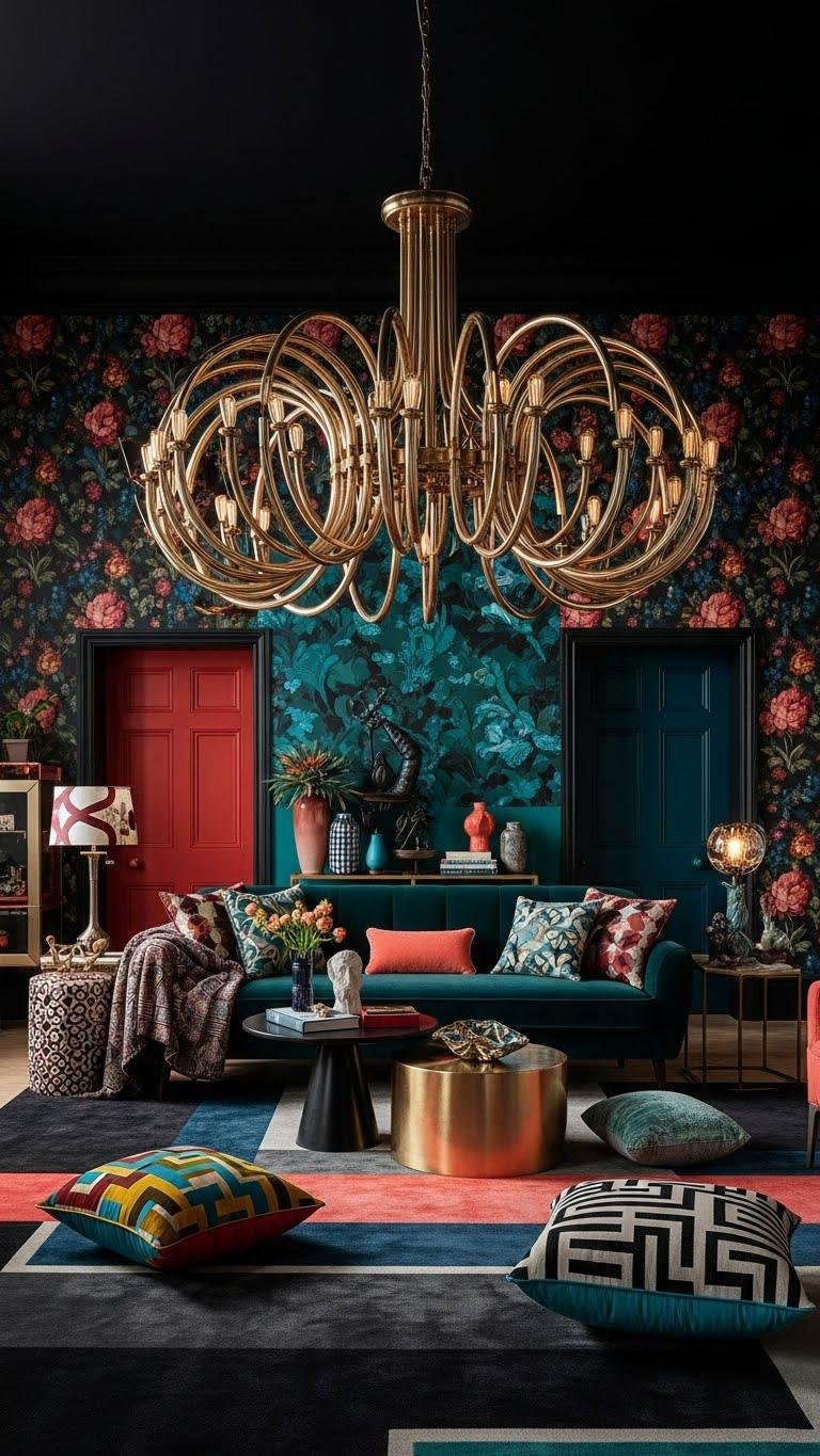 After balancing bold florals and tight geometrics, bring the room into focus with a showstopping light fixture that anchors the composition. Choose oversized pendants or sculptural chandeliers to declare intent, sculpting shadow and scale. You’ll mix materials, finish, and unexpected color to liberate the space — lighting becomes artwork, mood-maker, and the fearless centerpiece that ties maximalist layers together.