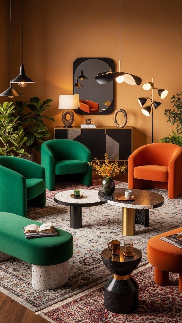Balance scale and color, add sculptural lighting to dramatize silhouettes, and mix unexpected materials. Let each object assert personality while keeping flow open and joyful.