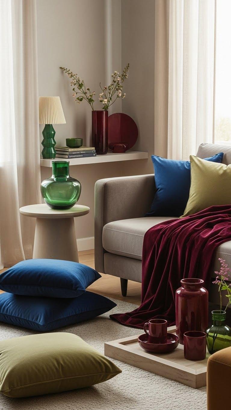 Once you’ve grounded the room in warm beiges, greys, clay and muted greens, add jewel-tone accents to bring focused energy and depth. Choose jewel accents like sapphire cushions, emerald vases and ruby ceramics to punctuate corners without overpowering calm. Layer velvet throws on a neutral sofa for tactile luxury. Let each saturated piece feel intentional, freeing the space with bold, edited confidence.