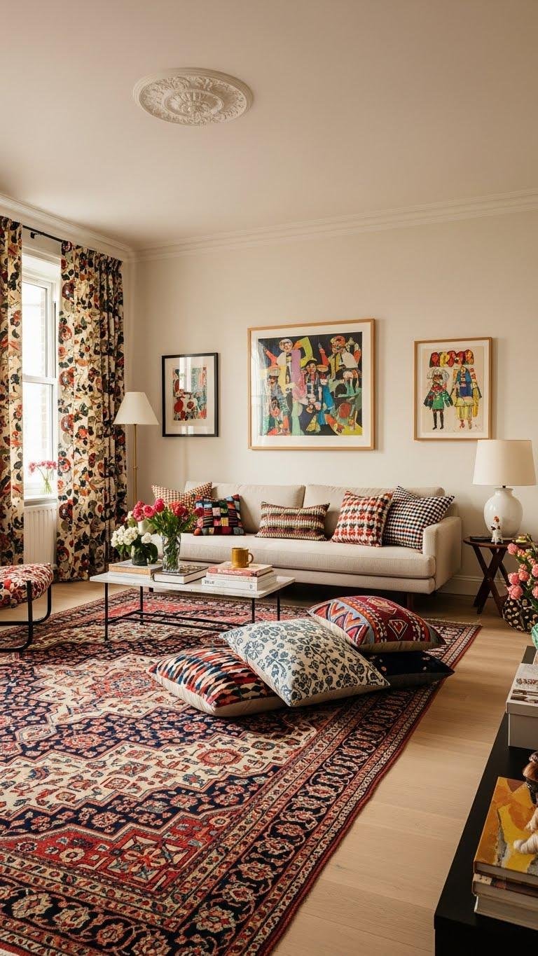 When you ground a room in a calm, neutral palette, you give bold patterns room to sing without overwhelming the space. Layer maximalist textiles—rugs, curtains, and art—with restraint, then scatter patterned throw pillows for playful contrast.
