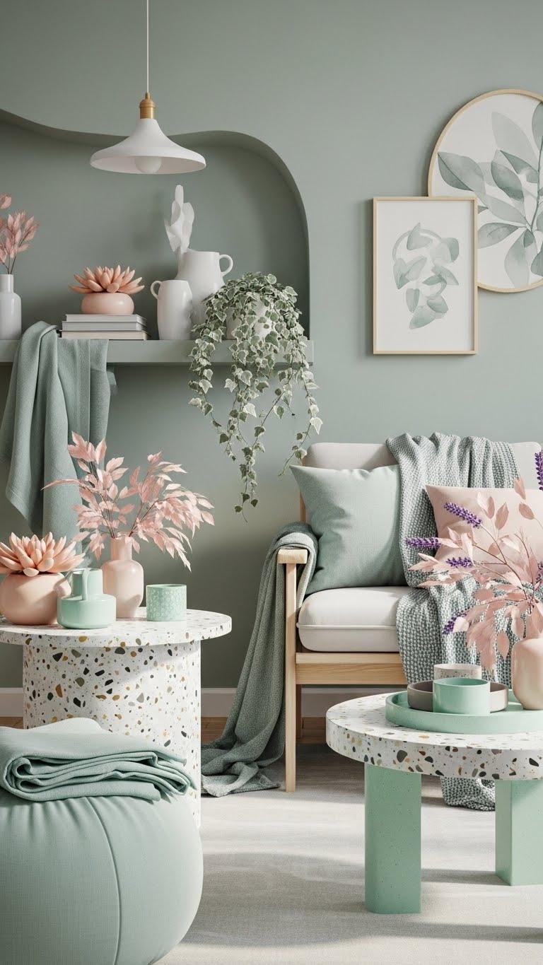 Use powdered sage and soft pistachio for walls, celadon textiles and seafoam layering for throws, mint terrazzo accents and blush foliage in vases, plus peach succulents and lavender ivy for effortless, freeing elegance.