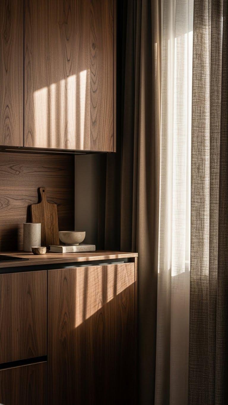 Choose Dark Wood Cabinetry With Texture-Rich Drapery