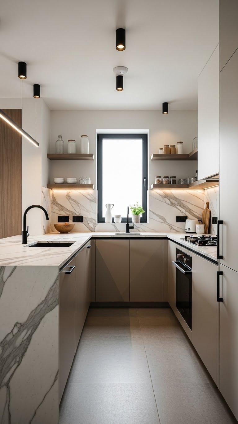 Choose Marble look countertops for drama without fuss, pair them with Matte black hardware for contrast, and stick to clean lines and durable materials.