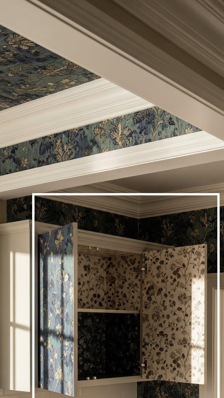 Having leaned into cornices and moldings, you can push that architectural narrative upward or into cabinetry by papering unexpected surfaces.