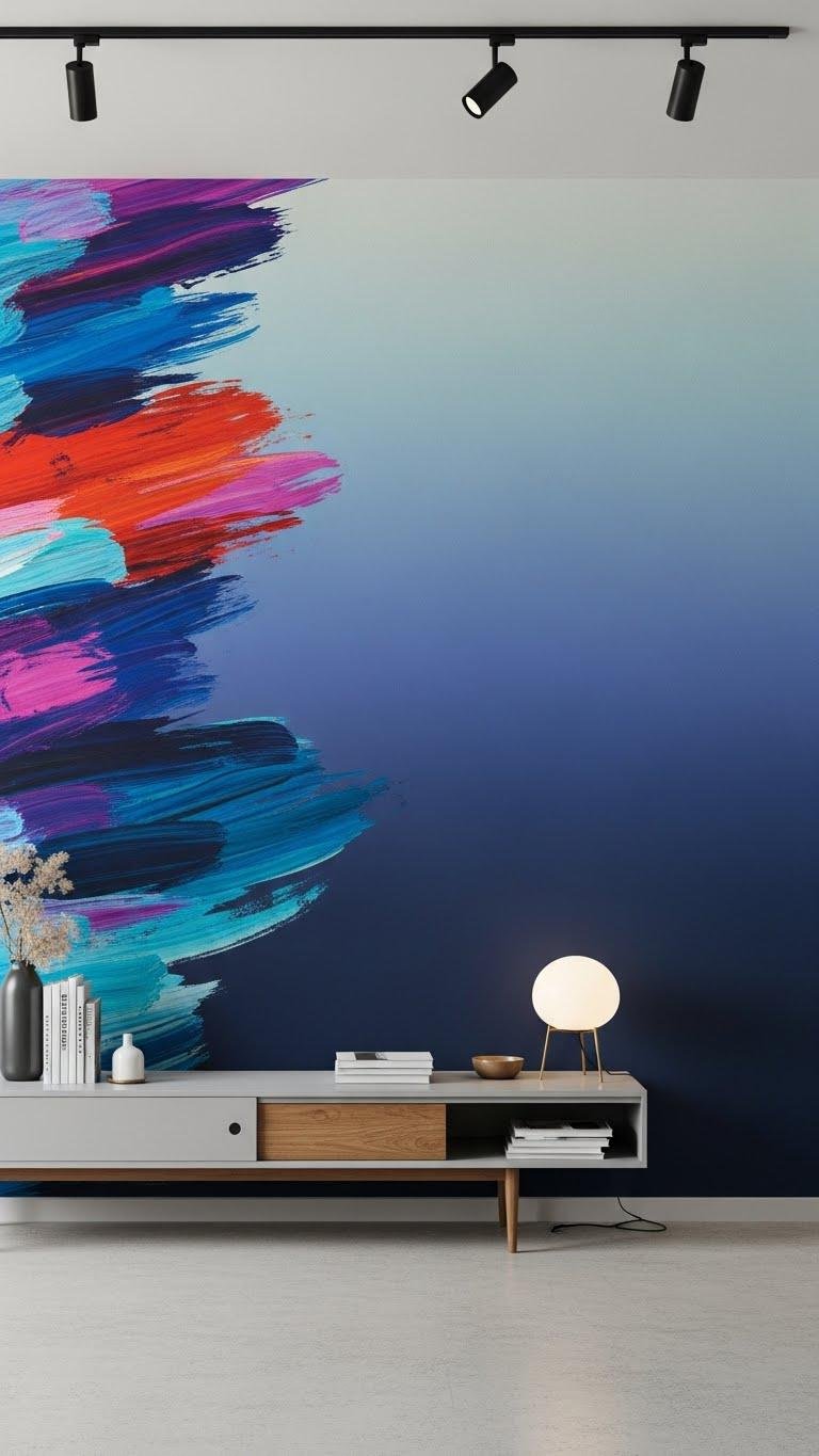 Because a bold wall can define the whole room, choose a mural or gradient that anchors your palette and mood—go for a large-scale scene, abstract brushwork, or a soft ombre that shifts from ceiling to baseboard.