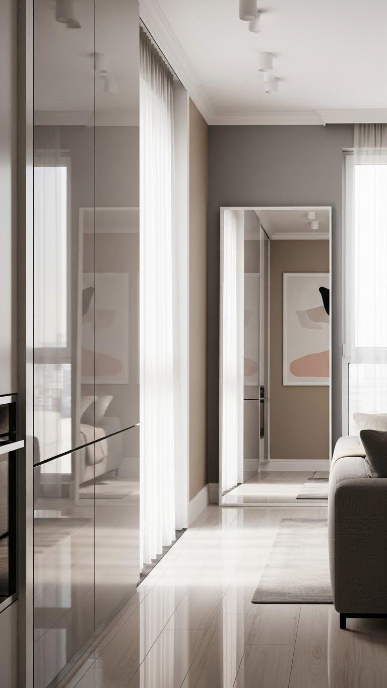 How can you brighten and visually expand a compact apartment without tearing down walls? Use high gloss on trim or a focal wall to reflect light and feel modern. Pair it with deliberate mirror placement — opposite windows or art — to double views and open sightlines.