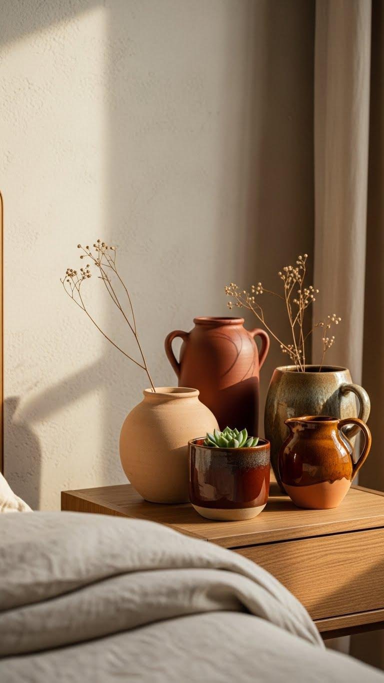 A cluster of terracotta pots or a single hand-thrown clay vase can instantly warm a neutral bedroom, giving you earthy color and tactile contrast without complicating the palette.