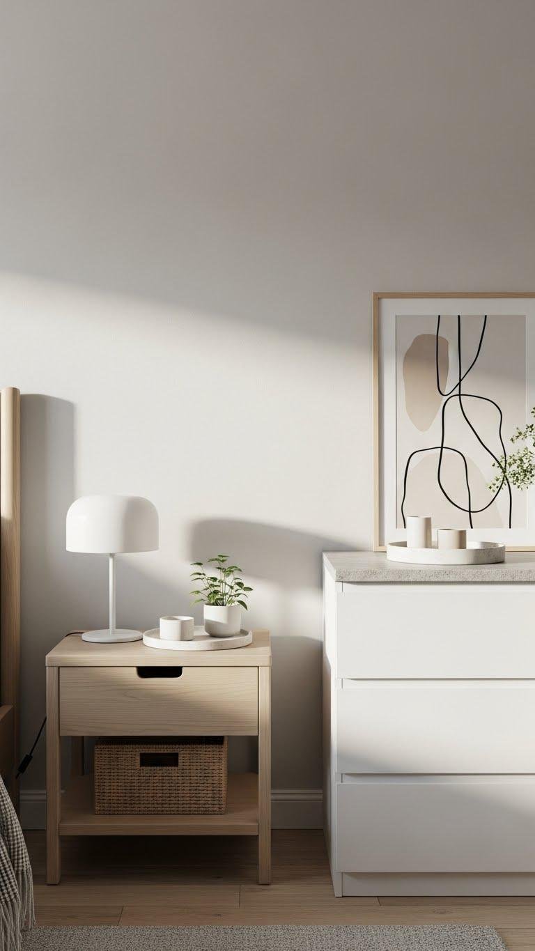 Keep surfaces pared back so each item has purpose and room to breathe — you’ll sleep better and feel calmer when countertops, nightstands, and dressers aren’t competing for attention.