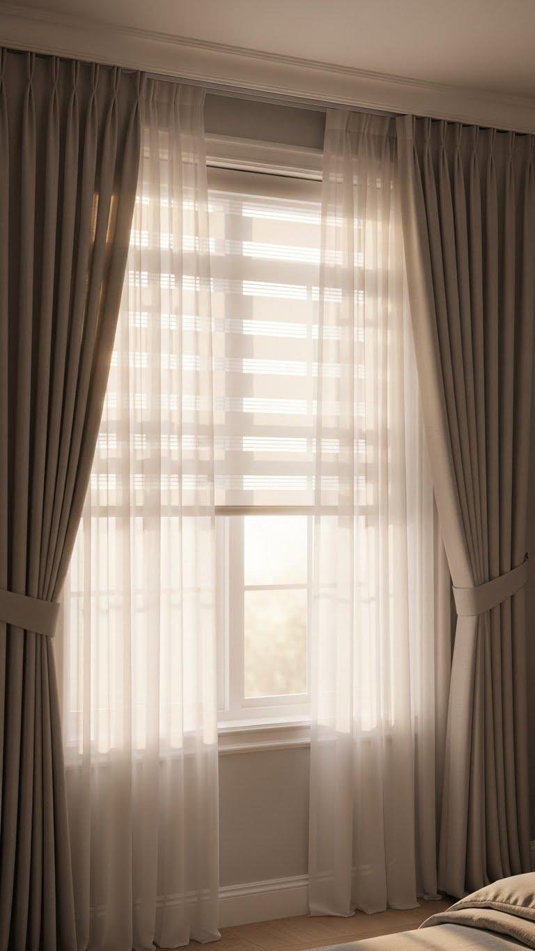 How can you let soft daylight in while keeping the room private and serene? Layer lightweight sheers with thicker drapes for privacy layering that still invites calm. Use neutral tones and adjustable rods so you control openness. Add a translucent blind for precise glow diffusion at sunrise or sunset. This setup feels freeing, practical, and quietly elegant while protecting your privacy.