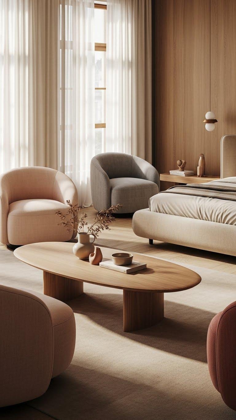 Soften the room’s edges by choosing furniture with gentle curves—think rounded armchairs, oval coffee tables, and beds with upholstered headboards that hug the frame. You’ll welcome rounded silhouettes and curved upholstery to calm sightlines and invite touch. Pick pieces that flow, balance scale, and leave breathing space so your bedroom feels liberated, serene, and effortless without clutter or visual tension.