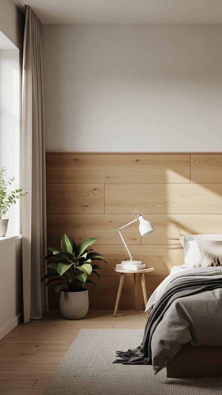 Install tongue-and-groove or shiplap panels to add instant warmth and texture to a neutral bedroom without overwhelming the calm palette. Choose sustainable wood tones, plan panel installation for a single accent wall, and keep lines simple.