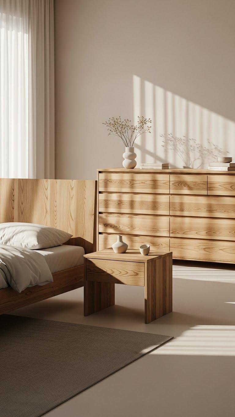 Anchoring the room with natural wood furniture gives your neutral bedroom warmth and visual weight without breaking the calm palette. Choose sustainable timber pieces with honest finishes that age gracefully.