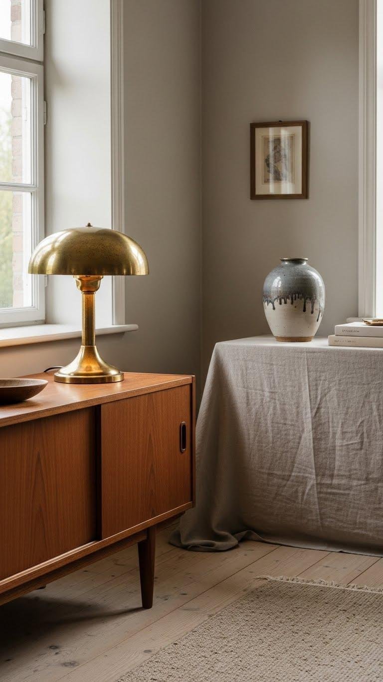 Mix in a few well-chosen vintage pieces to give a neutral scheme character without cluttering it—think a patinated brass lamp, a mid-century sideboard, or a hand-thrown ceramic vase that reads as intentional, not accidental. You’ll curate selectively, use flea market sourcing for stories, prioritize patina preservation over polishing, and arrange pieces to feel effortless, freeing your space while honoring history.