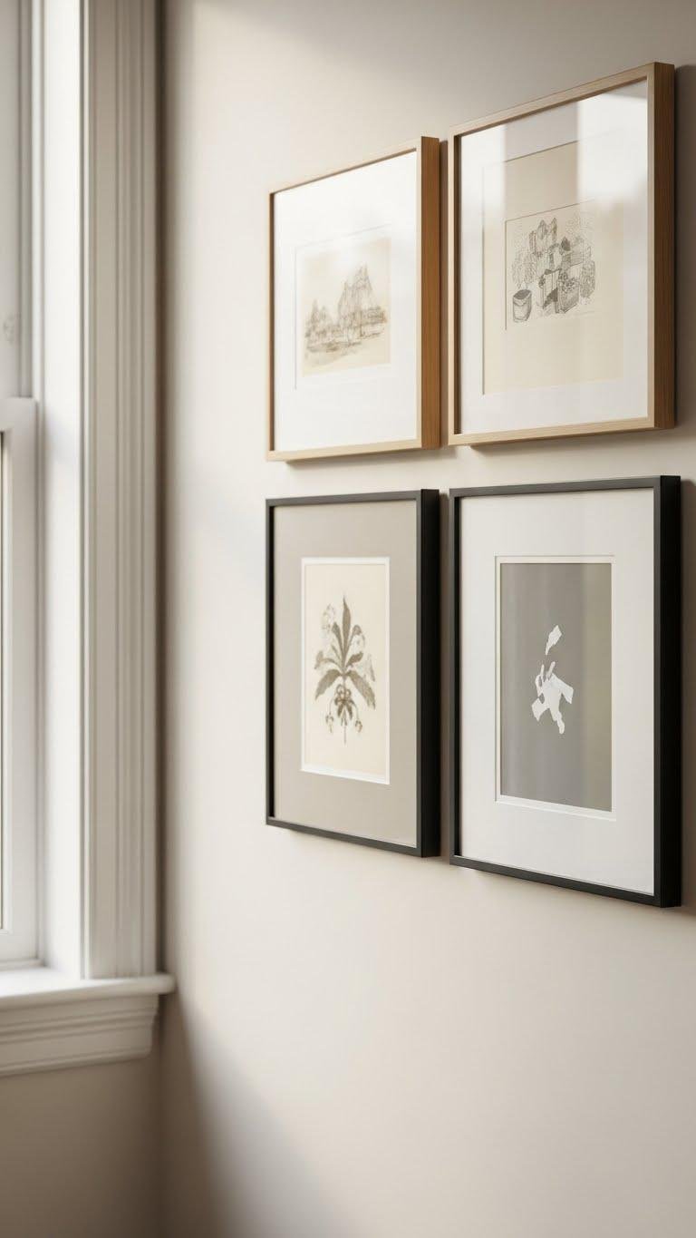 After you’ve curated a few vintage pieces, give your wall art the same quiet treatment by framing it with simple neutral mats. You’ll choose matte frames and museum quality mats to let works breathe, pairing archival mats for longevity. Minimalist framing sharpens focus, elevates composition, and frees your space from visual noise—clean, enduring choices that feel effortless and intentional.