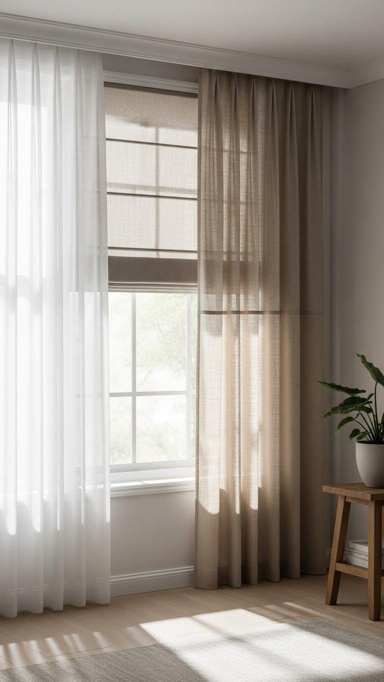 Layer neutral window treatments to add depth and control light without stealing the room’s calm—start with a sheer panel for daylight diffusion, add a heavier linen or cotton drape for privacy and texture, and finish with a structured blind or roman shade for insulation and clean lines.