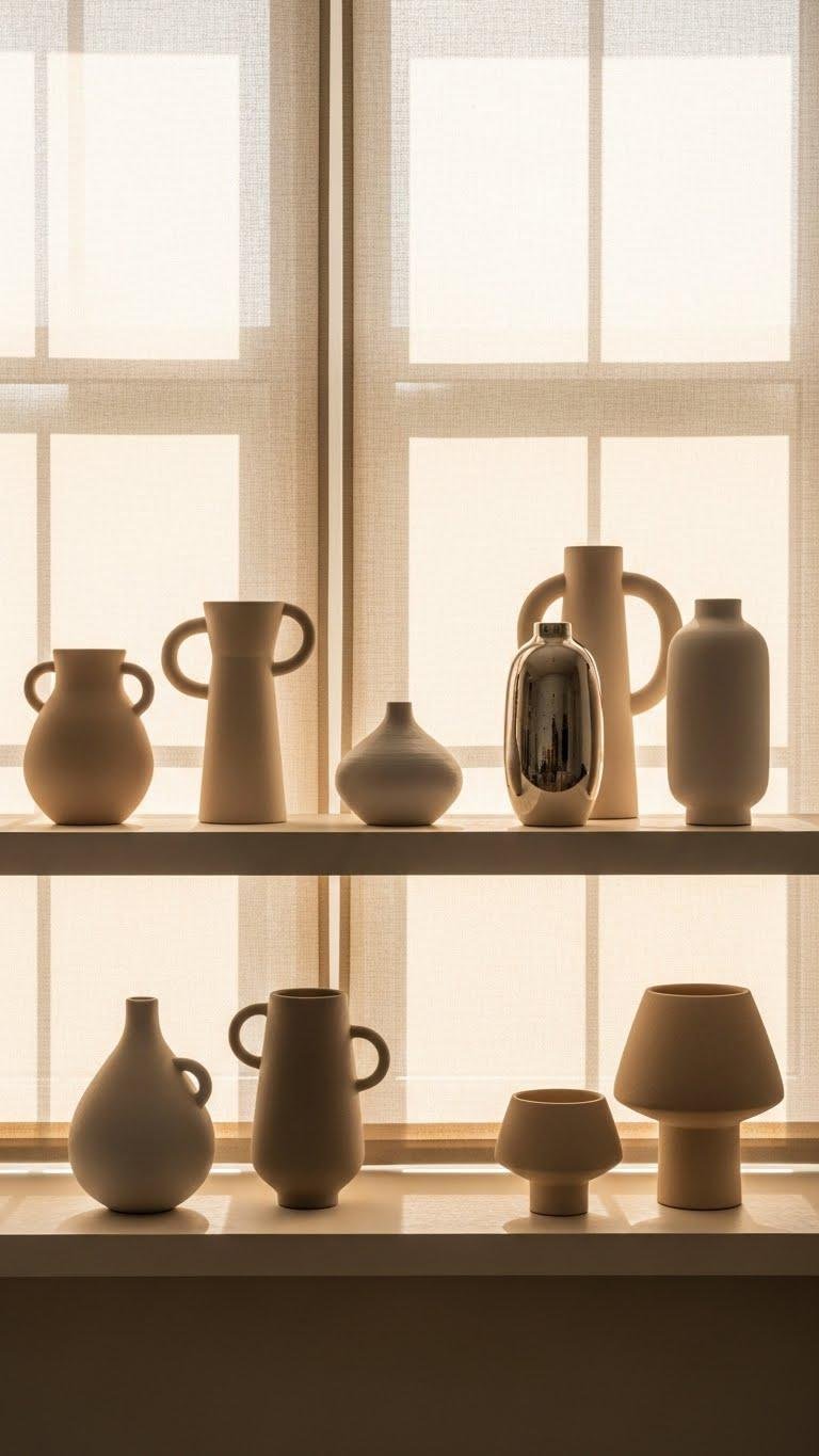 Soft, textured window treatments set the stage for sculptural ceramic accessories to take center without upsetting the calm — think of ceramics as the three-dimensional punctuation that complements fabric and light.