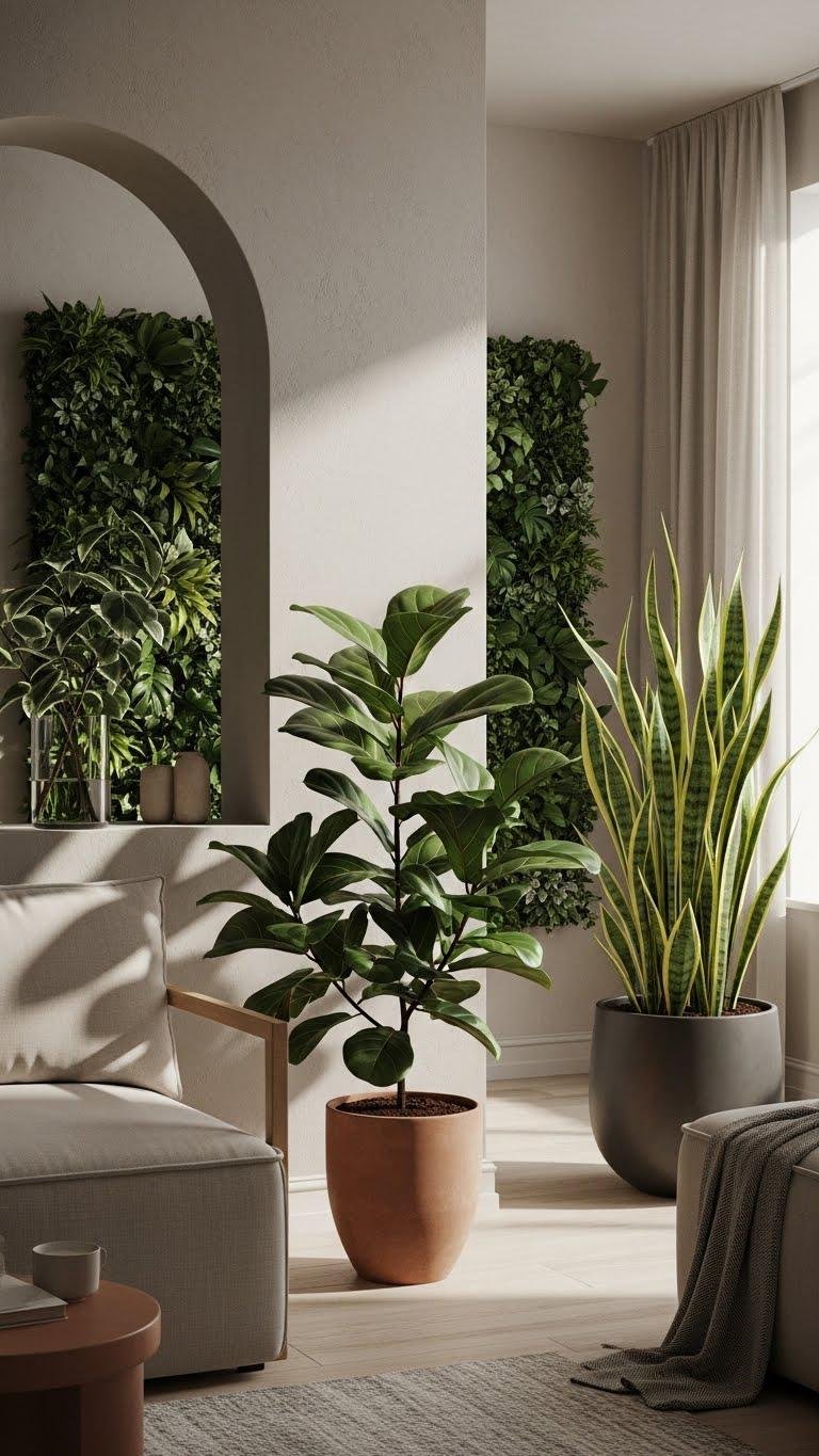 Often, you’ll use plants to punctuate a neutral scheme and introduce instant contrast without overwhelming the calm — choose sculptural foliage, varied leaf textures, and deep greens to lift beige, gray, and clay tones. You’ll favor low maintenance plants and bold statement pots, place a dramatic fiddle leaf or snake plant near seating, and consider vertical greenwalls for freedom-filled, living art that energizes muted palettes without clutter.