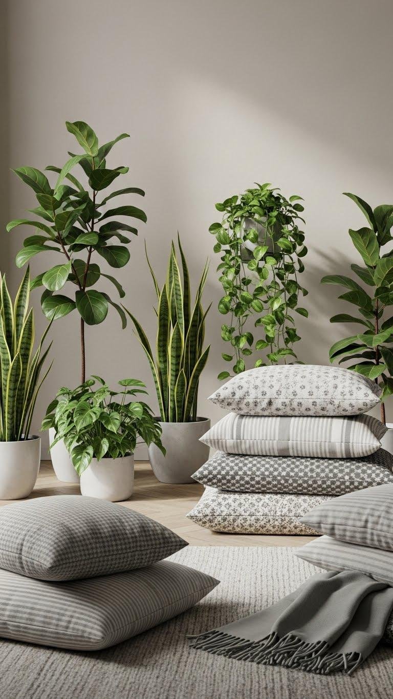 Bringing plants into a neutral room gives you a clear palette to play with, so use tone-on-tone pattern mixing to add depth without breaking the calm. You’ll layer monochrome patterning—subtle stripes, geometrics, soft florals—in muted shades. Choose tonal printwork on cushions, rugs, and throws to create movement while keeping serenity. Trust restraint; freedom lives in curated simplicity.