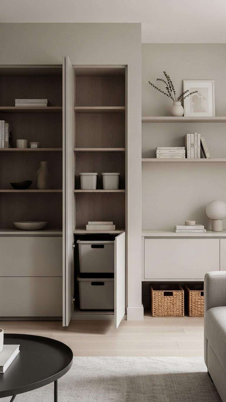 When you design a neutral room, prioritize storage that’s both purposeful and pared back so every piece earns its place; opt for low-profile cabinets, built-in shelving, and concealed bins that keep clutter out of sight while maintaining clean lines.