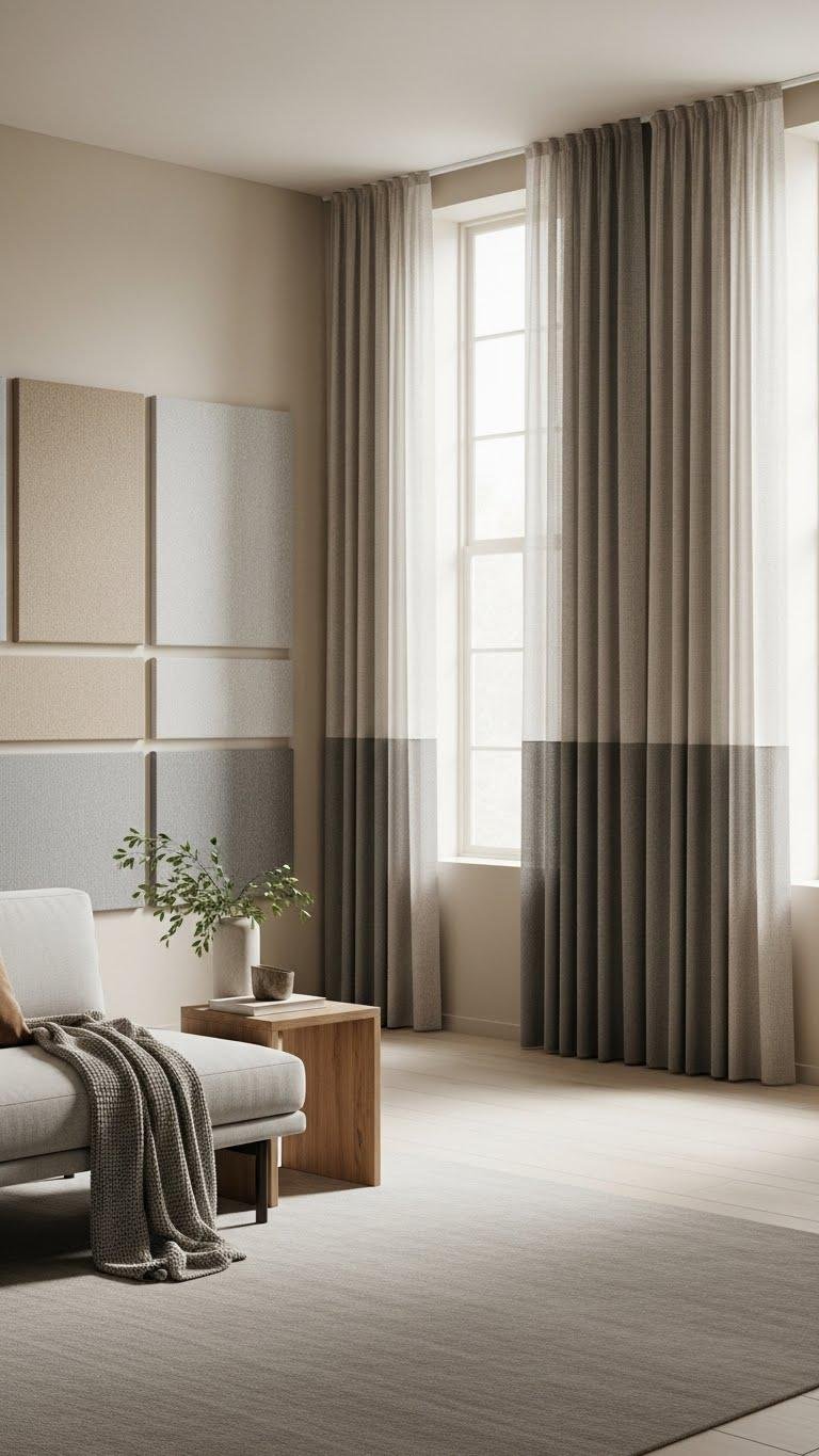 Storage keeps surfaces serene, but sound shapes how you actually feel in the room—so add soft acoustic fabrics and panels to complete the calm. You’ll choose fabric panels and acoustic curtains that absorb echoes without stealing light.