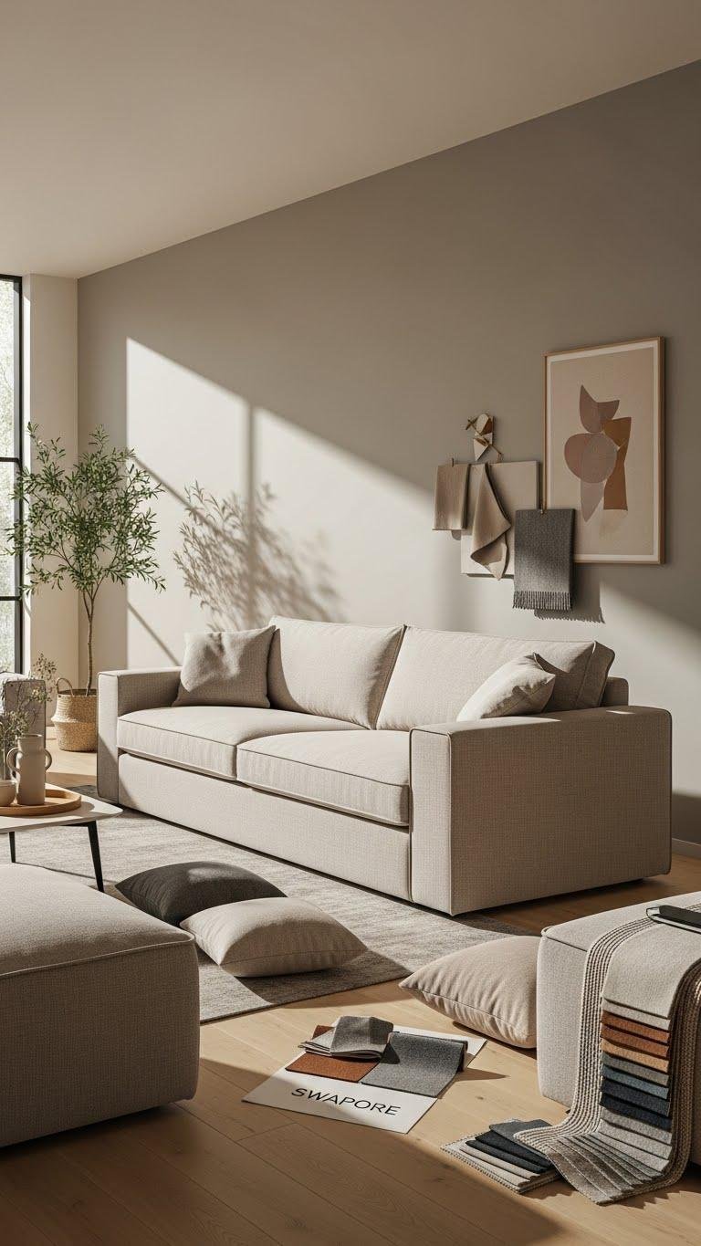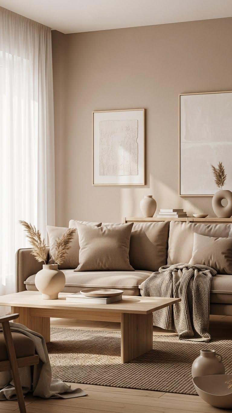 You’ll lean on taupe accents to define seating and texture, letting beige anchors ground walls and larger pieces.