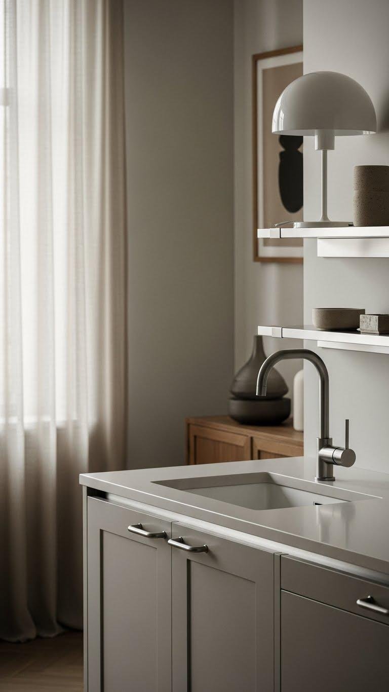 Introduce sanded stainless and subtle metal accents to give a neutral scheme quiet sophistication without upending the calm. You’ll add sanded stainless accents on fixtures and hardware, then balance them with subtle metal layering through trims, lamps, and small decor. Keep finishes matte or brushed, limit contrast, and let these restrained metals free the space while preserving the serene, timeless aesthetic.