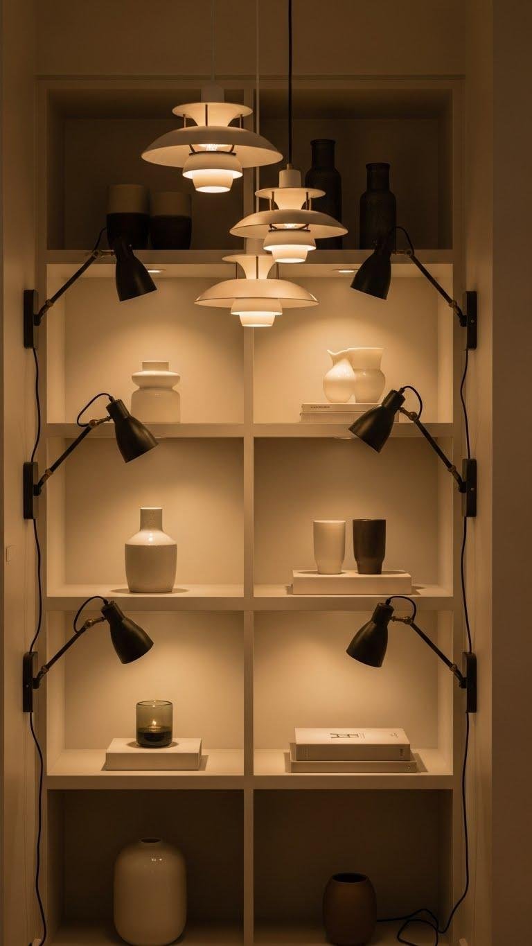 Shelving that reads like a small gallery benefits from lighting that flatters objects without screaming for attention, so choose fixtures that quietly elevate the room. You’ll prefer layered pendants for depth and adjustable sconces for directional focus.