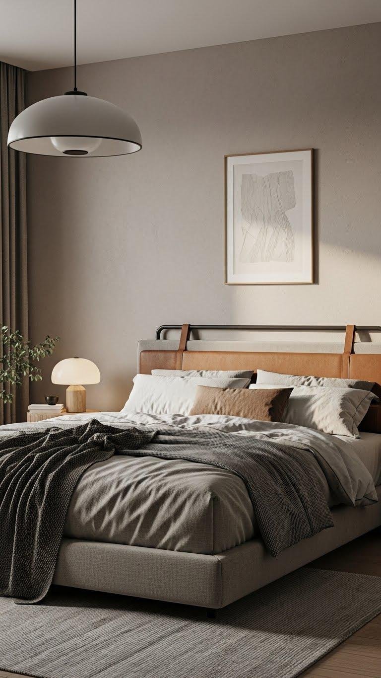 Start with a couple of warm taupes and sandy beiges as your room’s backbone so every other element — from linens to lighting — reads cohesive and calm.