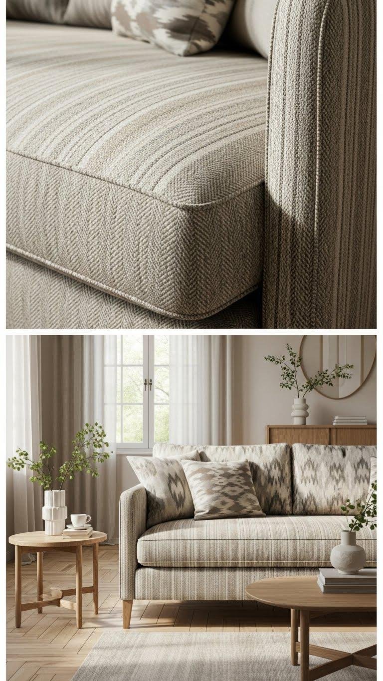 When you choose subtle patterned neutrals for upholstery, you get the visual interest of pattern without disrupting a calm palette—think small-scale herringbones, fine pinstripes, or tone-on-tone geometrics in warm taupe, greige, or soft ivory.