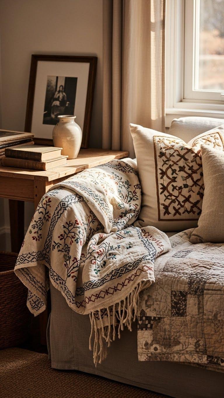 Bring warmth and character to neutral rooms by choosing quality textiles and meaningful heirlooms that speak softly but unmistakably to your story. You’ll mix heirloom textiles and memory textiles as curated evidence of life lived well, layering artisanal embroidery for texture and intent. Choose pieces that free you: minimal, authentic, durable, and personal, so your neutral space feels intentional rather than generic.