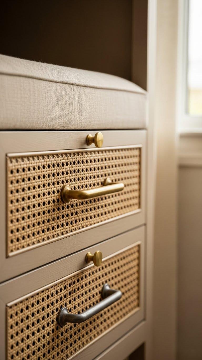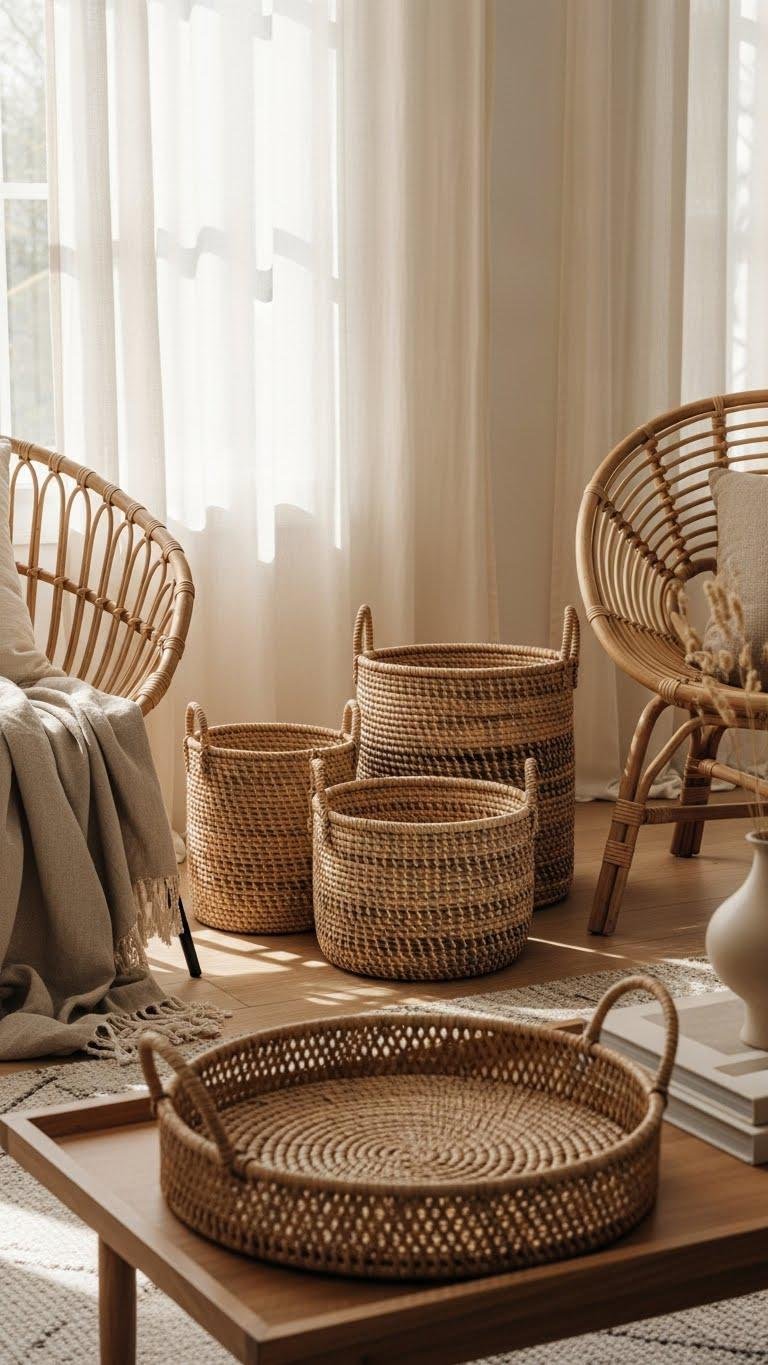 You’ll rely on woven storage to hide clutter while keeping texture visible.