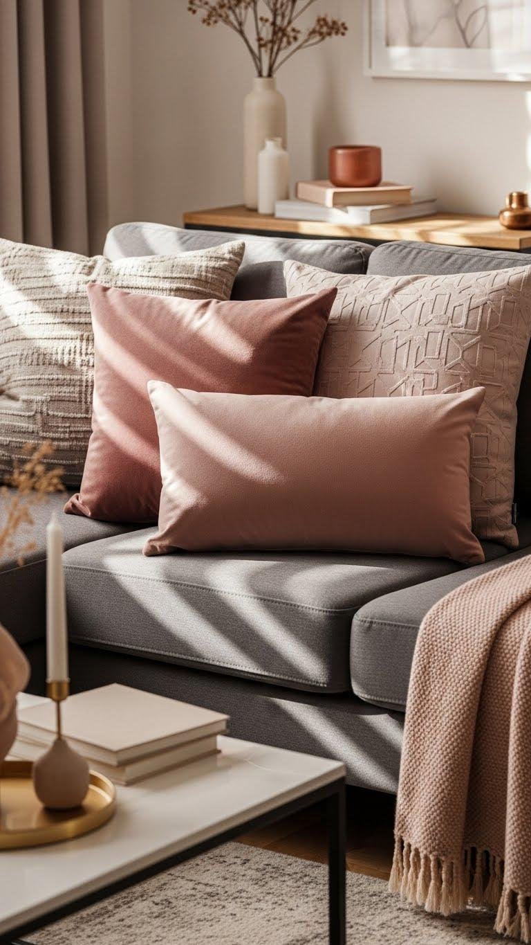 Layer Dusty Rose Throw Pillows on a Gray Sofa