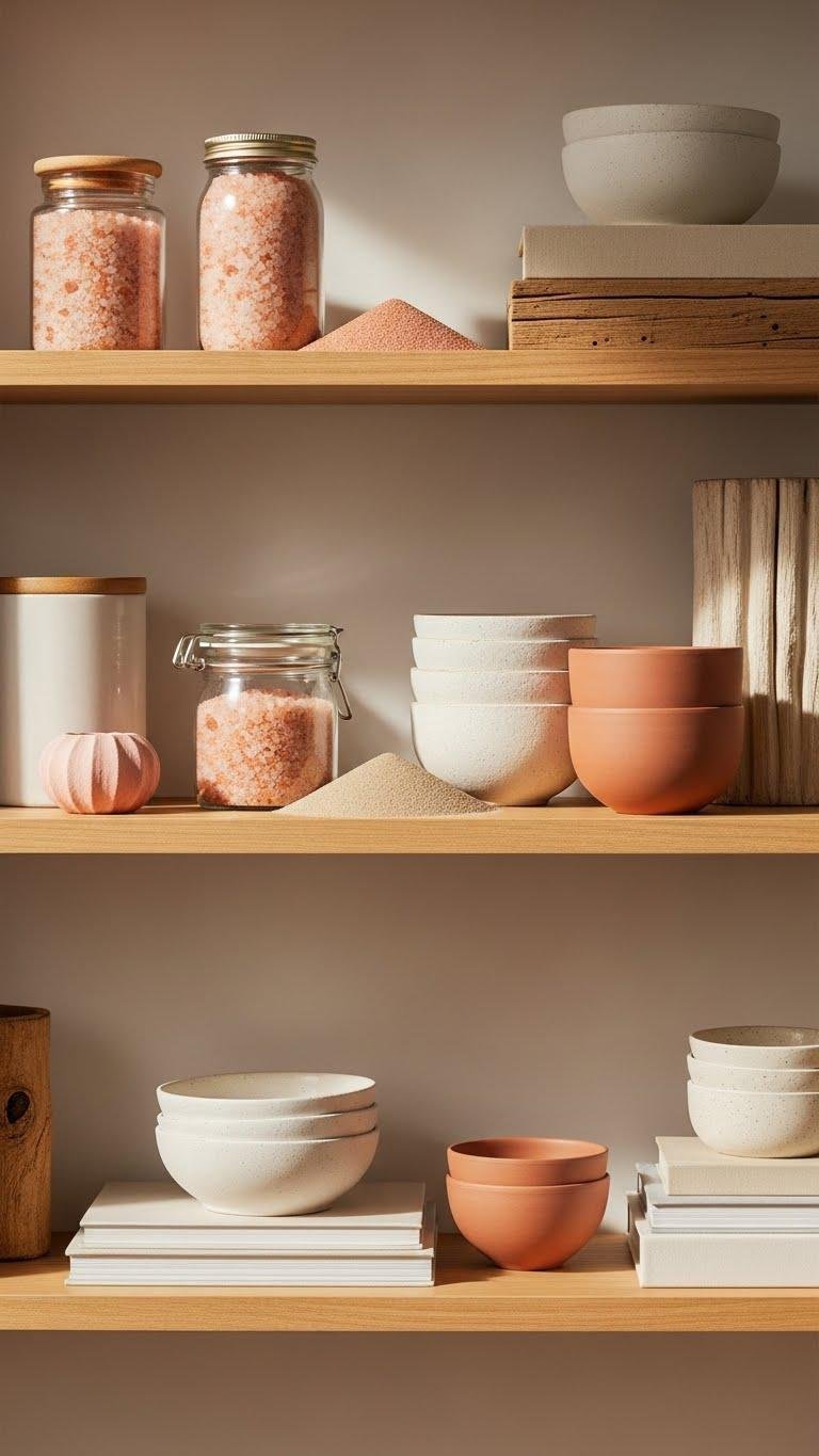 Layer pink salt and desert sand pieces across your open shelving to create a warm, layered tableau that feels both intentional and relaxed. You’ll mix salt jars, textured ceramics and weathered wood to build effortless desert vignettes. Keep negative space, vary heights, and repeat tones so each shelf reads calm and liberated—minimal fuss, maximum warmth and modern ease.