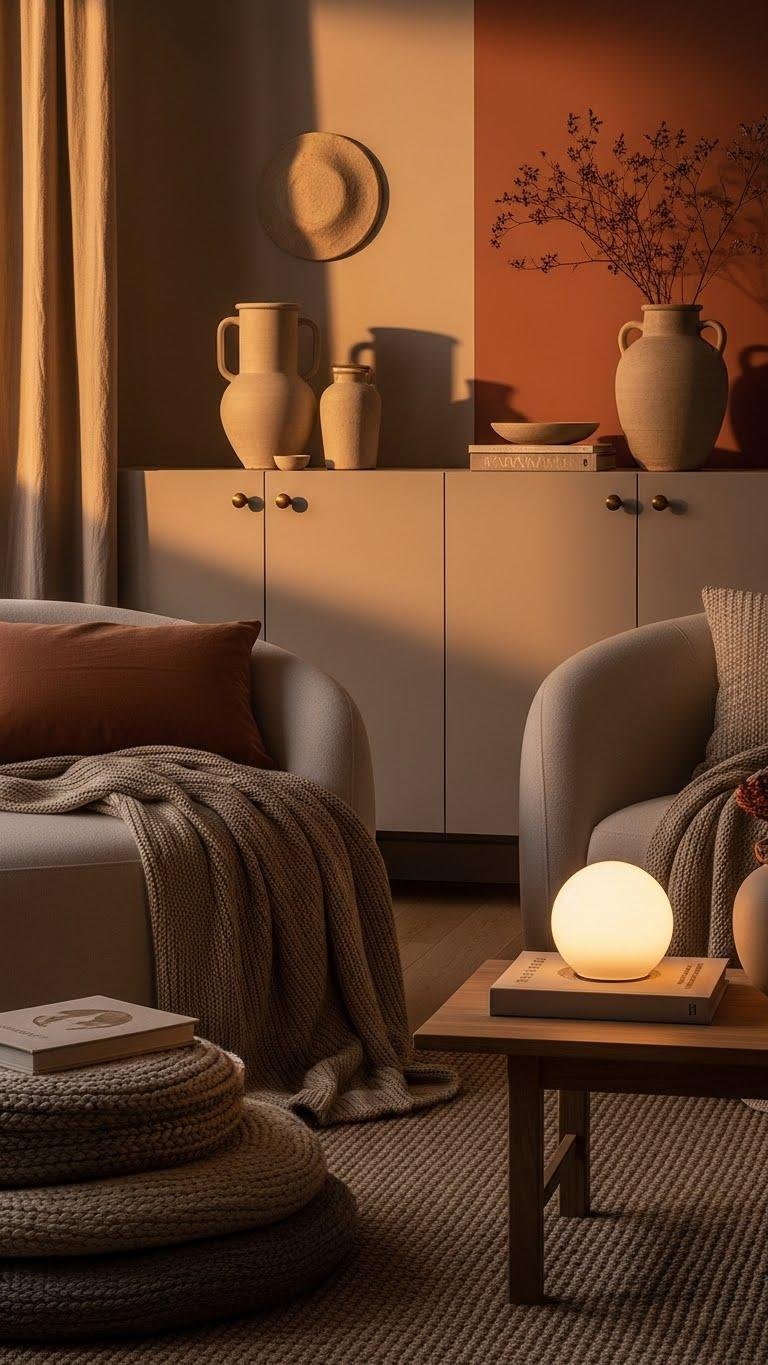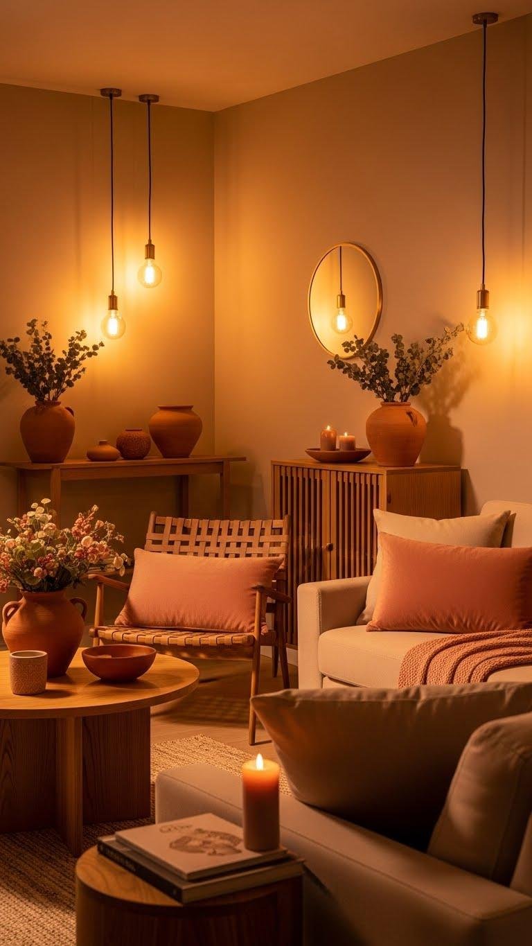 Although LED options boast efficiency and longevity, swapping cool, blue-tinted bulbs for warm white ones (2700–3000K) instantly softens a room and brings out the blush, sand, and terracotta tones in your palette.