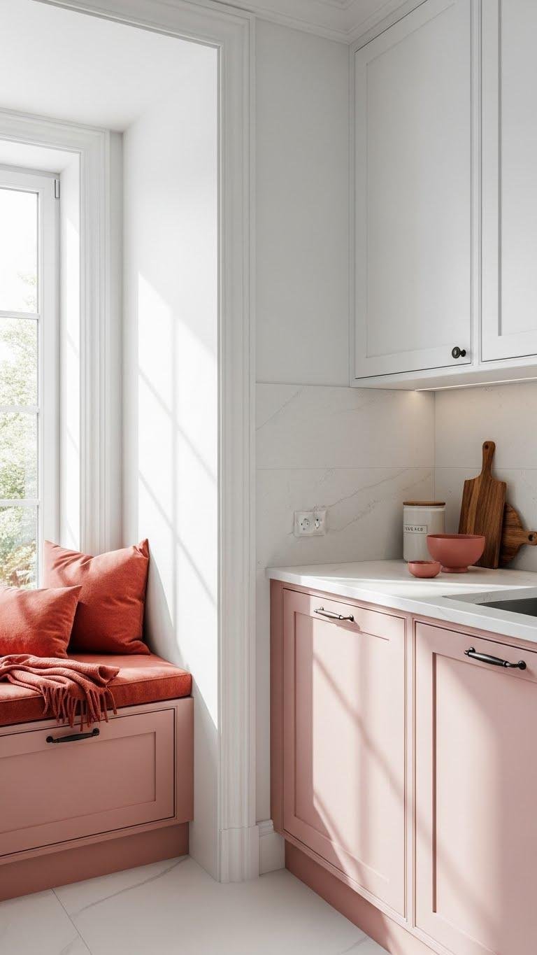 After you’ve warmed a nook with Nether Red accents, extend that calm across a room by pairing crisp white millwork with plaster-pink cabinetry. You’ll create airy balance while asserting personality—choose contrasting hardware to punctuate lines and avoid sweetness.