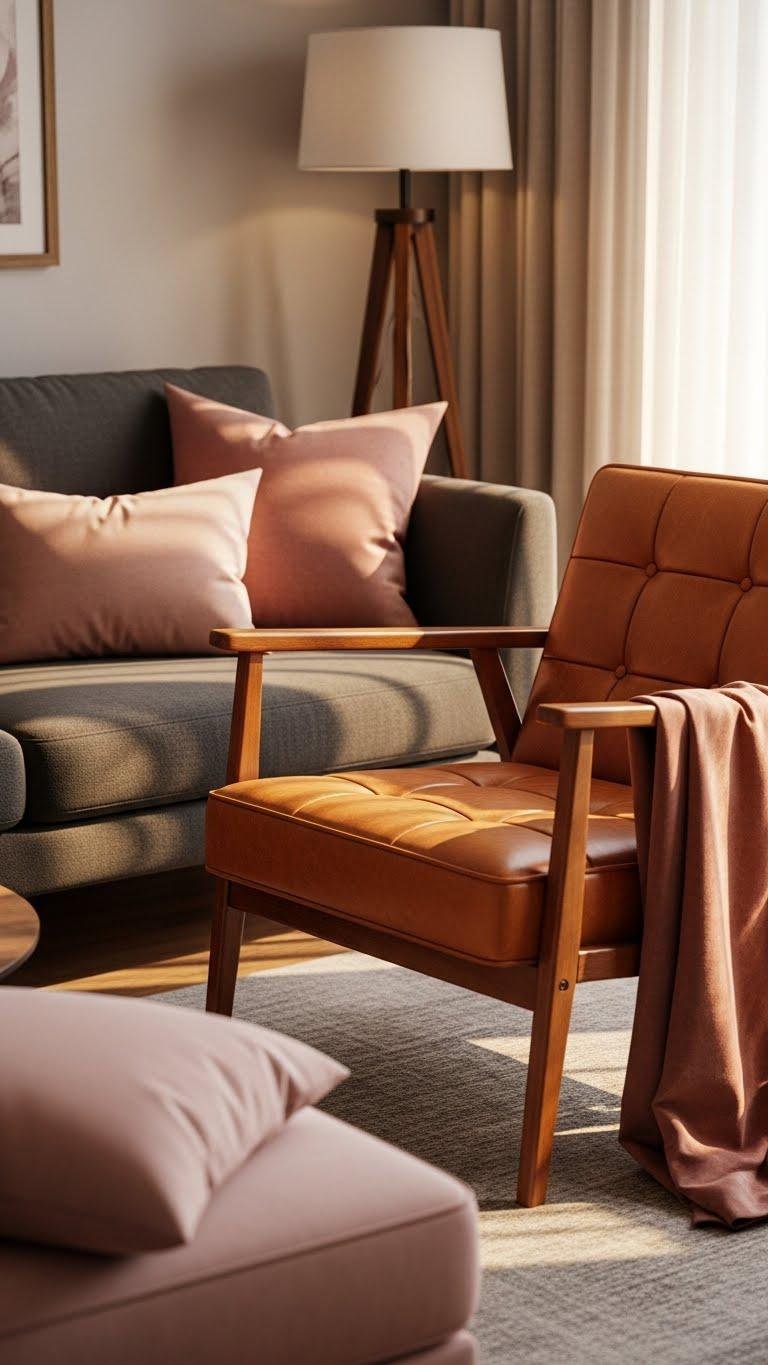 Pairing a cognac leather armchair with your gray sofa layered in dusty rose pillows brings warmth and a grown-up edge to the seating area. Choose a chair with vintage tufting and clean lines, then accent with blush cushions or a suede textures throw. You’ll create contrast and freedom in the room, a modern, relaxed vibe that feels both curated and effortless.