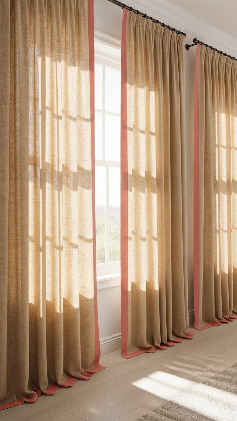 A set of sandy beige drapes trimmed in coral pink gives your windows a quiet, tailored voice—softening sunlight while injecting a fresh, modern edge. You’ll choose drapery texture that reads natural yet refined, pairing linen-like weave with crisp coral trim for instant coastal contrast.