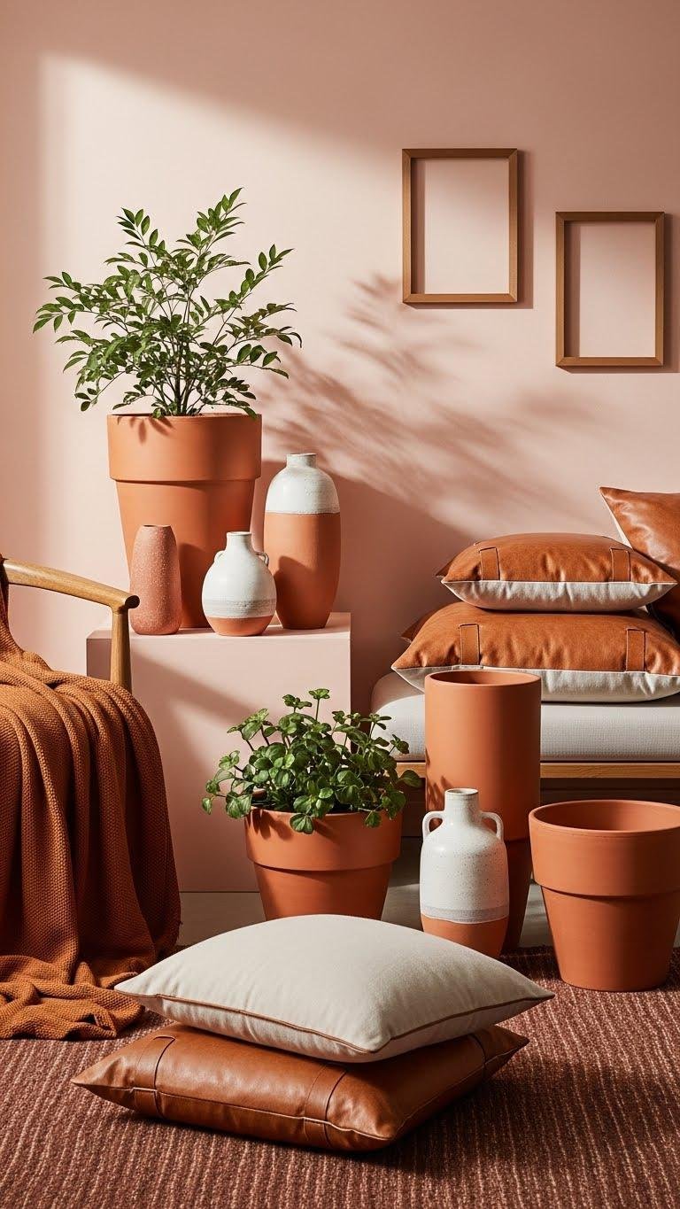 You’ll layer terracotta planters, matte ceramic vases and leather-trim cushions to create clay contrast against soft blush walls.