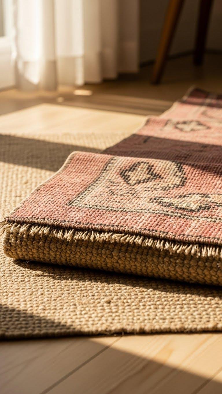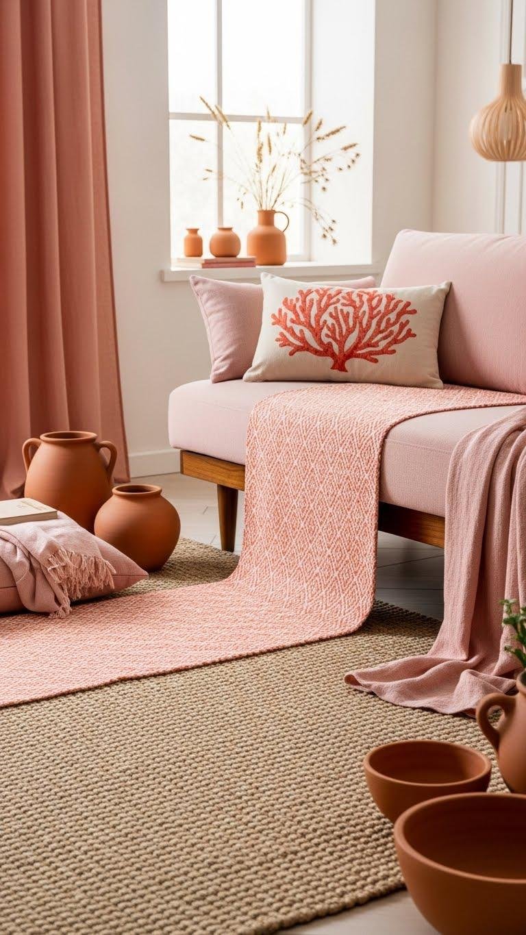 Ground the space with a neutral rug that balances the warmth of your terracotta and the softness of pink linen, then introduce a coral-pink pattern to tie everything together. Choose natural sisal for texture and durability, then layer a subtle coral motif runner or throw pillow. You’ll create an airy, liberated vibe that feels modern, grounded, and effortlessly cohesive.