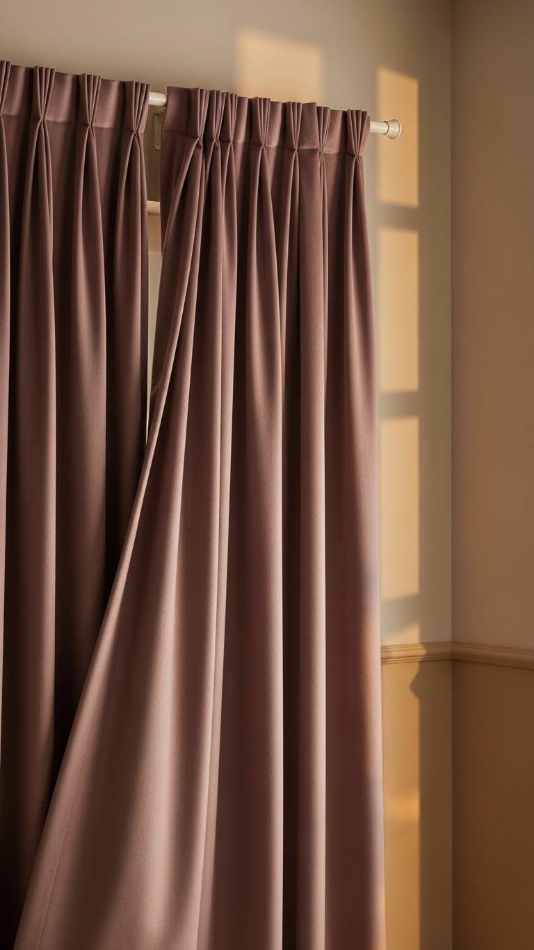 When you hang mauve curtains against warm neutral walls, the result feels intentionally soft rather than sweet — the dusky purple adds depth and a refined warmth that elevates beige or sand tones. Choose velvet pleating for structure, a thermal lining to regulate temperature and a privacy lining for calm.